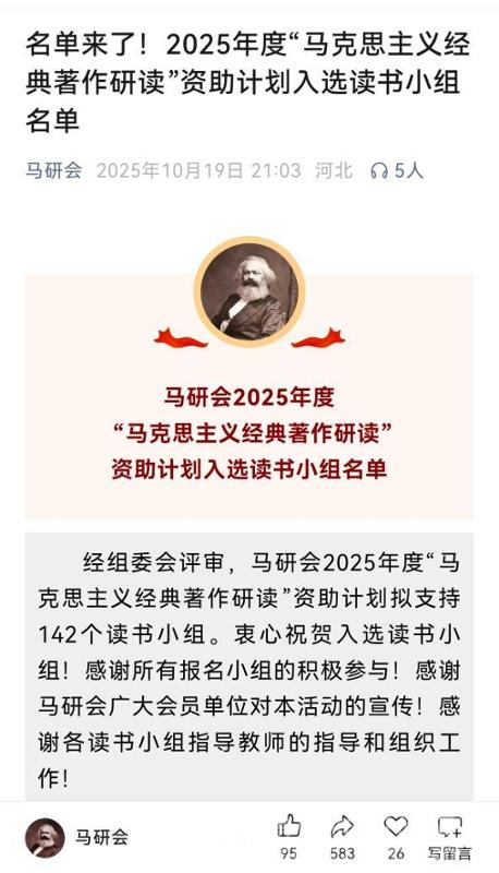 2025年10月19日,中国高等教育学会马克思主义研究分会(以下简称“马研会”)2025年度“马克思主义经典著作研读”资助计划入选名单正式公布,来自北京大学、中国政法大学、中国人民大学、南京大学、吉林大学、浙江大学、西南大学等高校的142个读书小组入选。贵州师范学院马克思主义学院组织申报的读书小组凭借扎实的筹备方案、鲜明的学习导向成功入选,获得专项资助支持,是2025年度贵州省唯一入选该资助计划的高校,体现了马克思主义学院在马克思主义经典研读领域的扎实工作与积极探索。这既是对学院马克思主义理论人才培养成效的权威认可,更是学院坚守“读原著、学原文、悟原理”育人初心的生动实践。