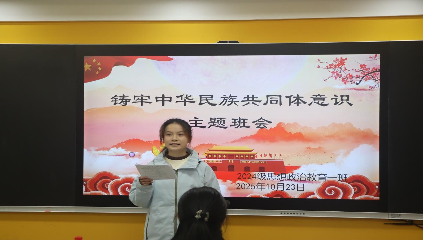 2025年10月23日,马克思主义学院2024级思想政治教育一班在智慧教室举办“铸牢中华民族共同体意识”主题班会。我校统战部正处级组织员林静、副处级组织员周昌霖以及秦敏和刘金群老师莅临本次班会,共同深入学习中华民族共同体理念,探索新时代民族团结的实践路径。