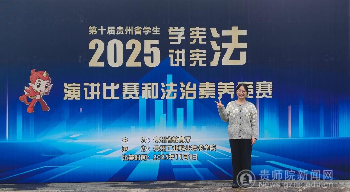 2025年11月1日,由贵州省教育厅主办的第十届全省学生“学宪法 讲宪法”活动省级决赛在贵州工业职业技术学院举行,来自全省9个市(州)和60多所高校的近150名选手同台竞技。在学校党委行政的领导下,在校团委等部门的指导下,马克思主义学院2023级思想政治教育专业学生张敏凭借出色的临场发挥、扎实的专业素养,荣获法治素养竞赛高校组一等奖(总分排名第二)。