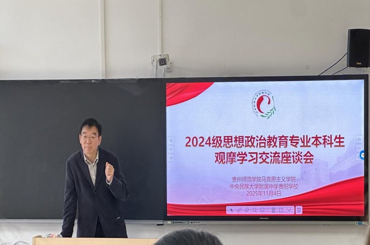 本网讯,为推动专业理论知识与教学实践深度融合,2025年11月4日下午,马克思主义学院2024级思想政治教育专业学生走进中央民族大学附属中学贵阳学校开展观摩学习交流活动。