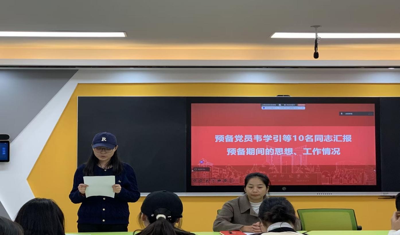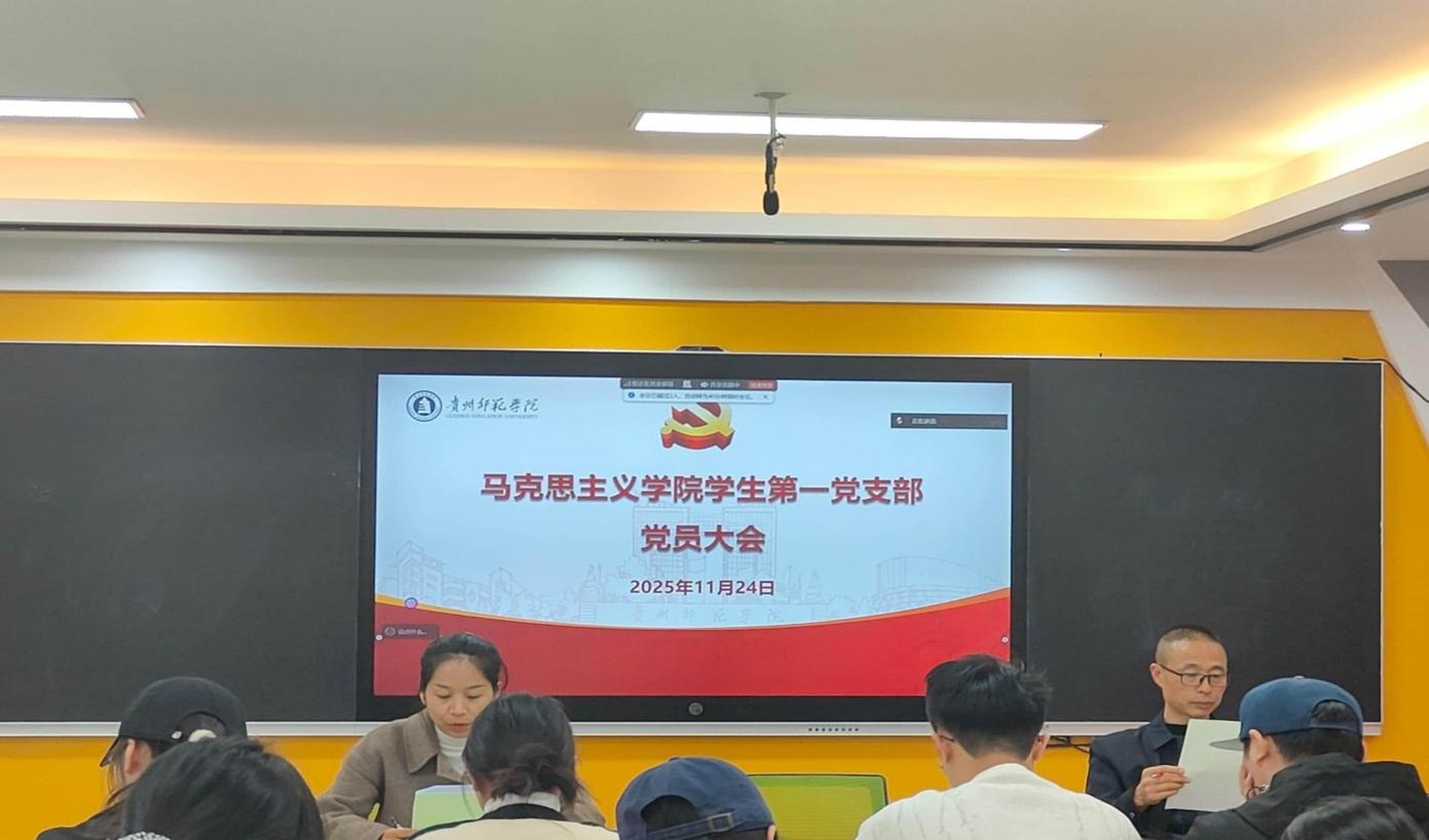 本网讯,2025年11月24日,马克思主义学院学生第一党支部于学院智慧教室召开预备党员转正支部大会。本次大会由支部组织委员王玉清同志主持,主要议题是讨论韦学引等10名预备党员的转正问题。会议严格按照《中国共产党发展党员工作细则》相关规定组织进行,与会人数符合章程要求,会议有效。