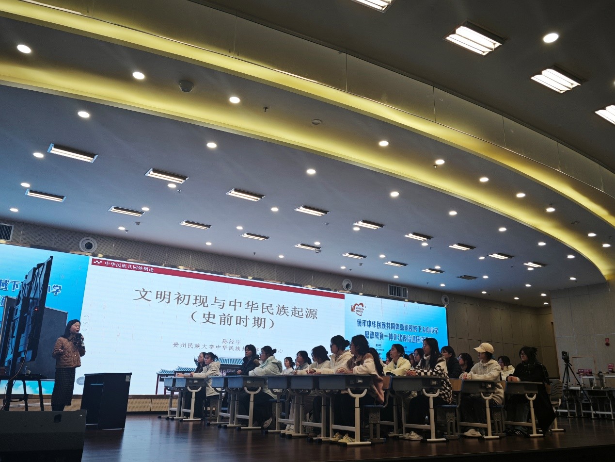 随后,活动进入核心环节——专题授课。本次授课围绕“铸牢中华民族共同体,共筑伟大复兴中国梦”主题,由小学、初中、高中、大学各学段名师分别授课。在大学学段授课环节,我院学生代表认真聆听了由贵州民族大学陈经宇老师主讲的《文明初现与中华民族起源》示范课。课程从中华文明起源的宏阔历史视角出发,运用丰富的考古发现与历史史料,以石器、陶器、玉器、青铜器的脉络,生动阐述了中华文明多元一体格局的形成过程,深刻论证了中华民族共同体发展的历史必然性与深厚底蕴。授课教师引经据典、深入浅出,将厚重的历史知识与铸牢中华民族共同体意识的核心要义巧妙融合,呈现了一堂既有历史深度又有理论高度且极具思想启迪性的思政“金课”。