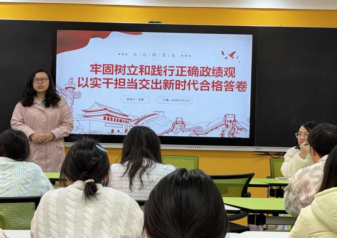 本网讯,为深入学习贯彻党的创新理论,进一步增强党员的党性修养和担当意识,2026年3月23日上午,马克思主义学院学生第二党支部在学院智慧教室开展“牢固树立和践行正确政绩观 以实干担当交出新时代合格答卷”专题党课活动。本次党课由党支部书记张静同志主讲,党支部全体党员和部分入党积极分子参加。
