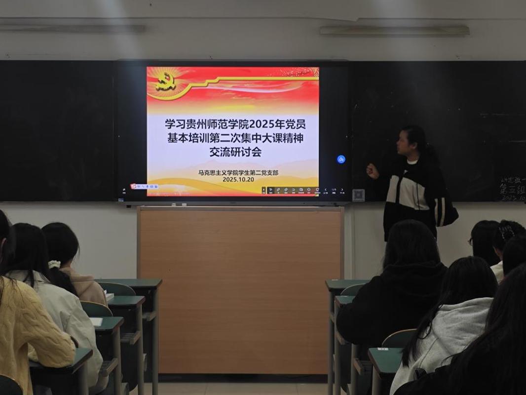 为进一步巩固党员基本培训集中大课的学习成效,引导广大党员准确把握新时代教育发展的方向与使命,2025年10月20日,马克思主义学院学生第二党支部在明辨楼508教室举行了学习贵州师范学院2025年党员基本培训第二次集中大课精神交流研讨会。会议由党支部书记张静同志主持,全体党员参与研讨。