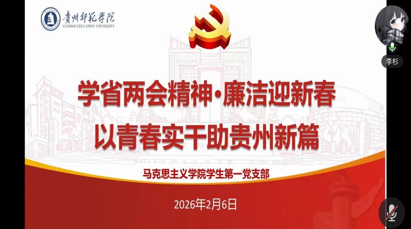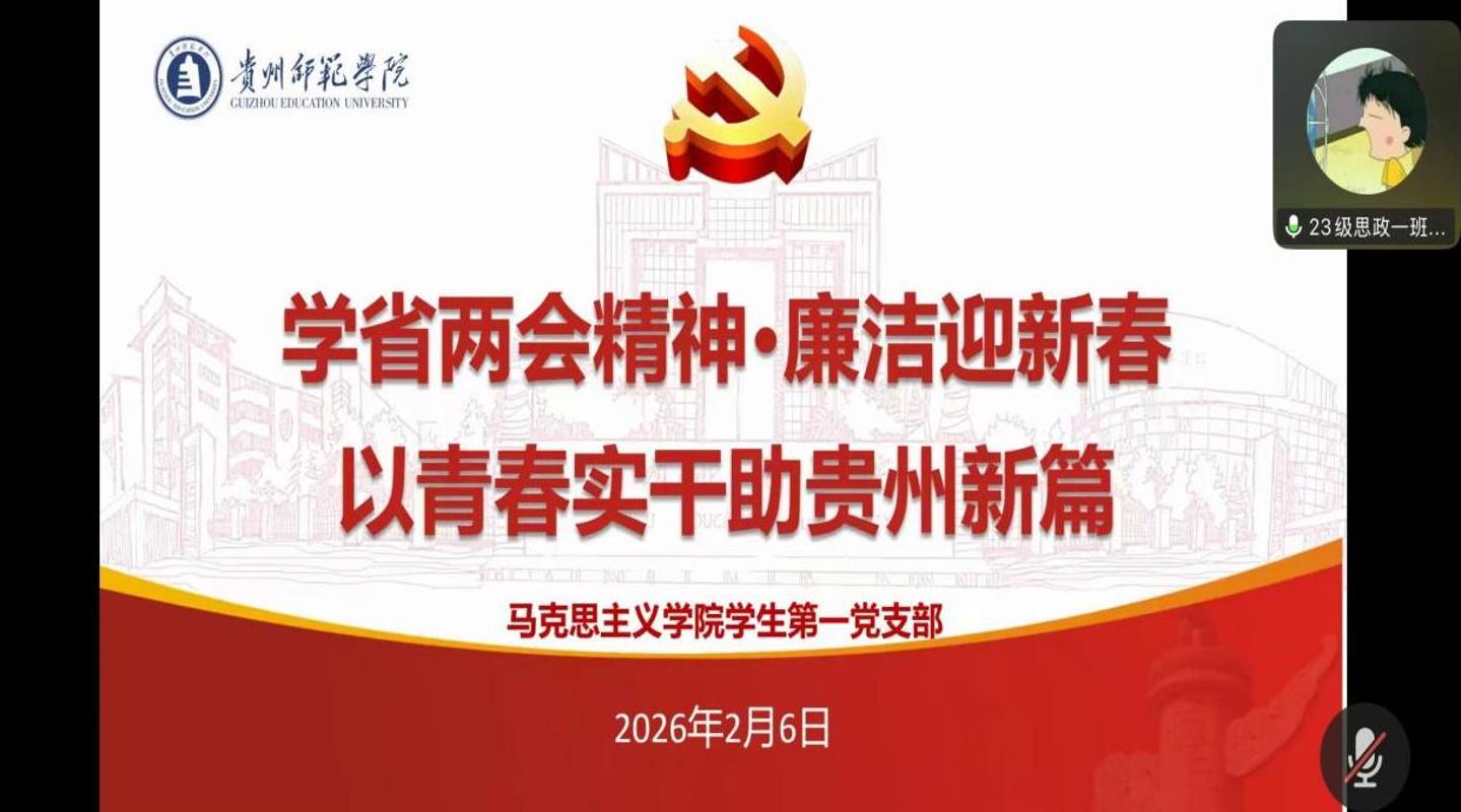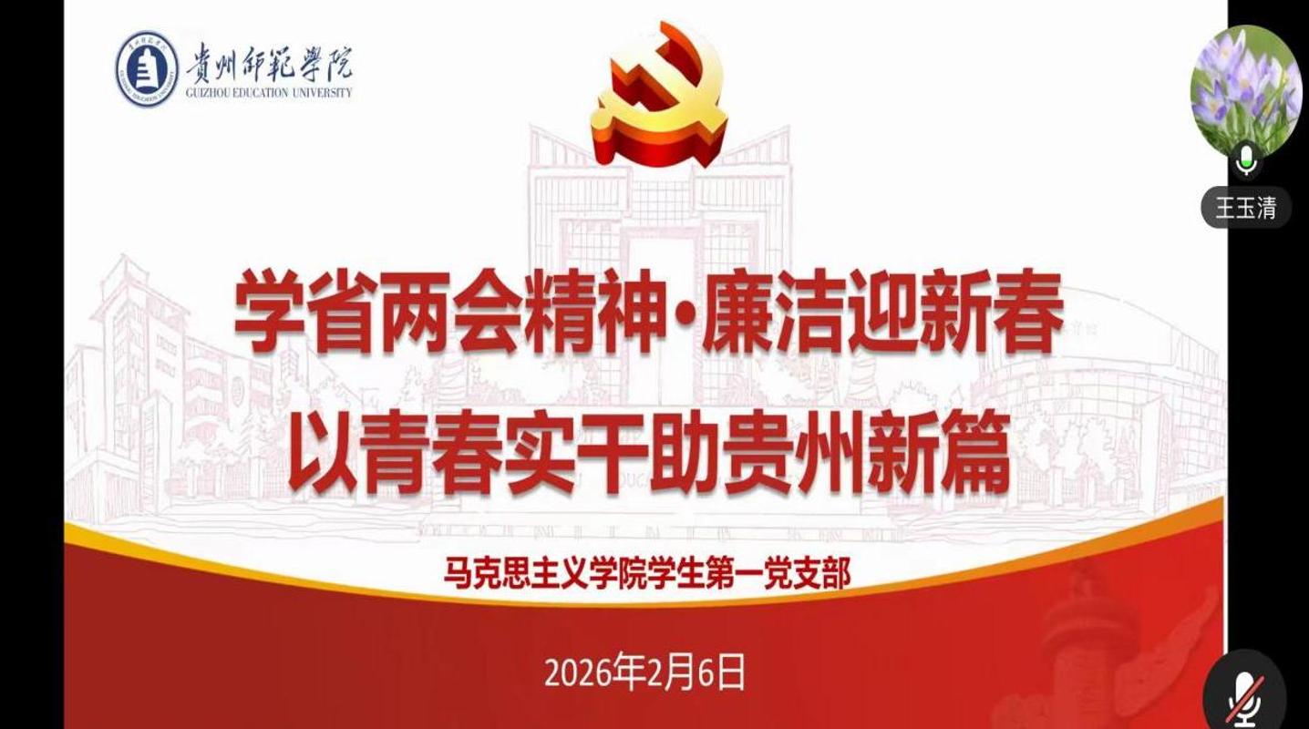 为深入学习贯彻省两会精神,引导青年党员在春节返乡期间发挥先锋模范作用,2026年2月6日,马克思主义学院学生第一党支部以线上会议形式,开展了“学省两会精神·廉洁迎新春”主题党日活动,围绕省两会精神学习和廉洁过节主题展开深入研讨,明确了学生党员在春节期间的实践方向和行动要求。活动由学生第一党支部组织委员王玉清主持,党支部全体同志参加会议。