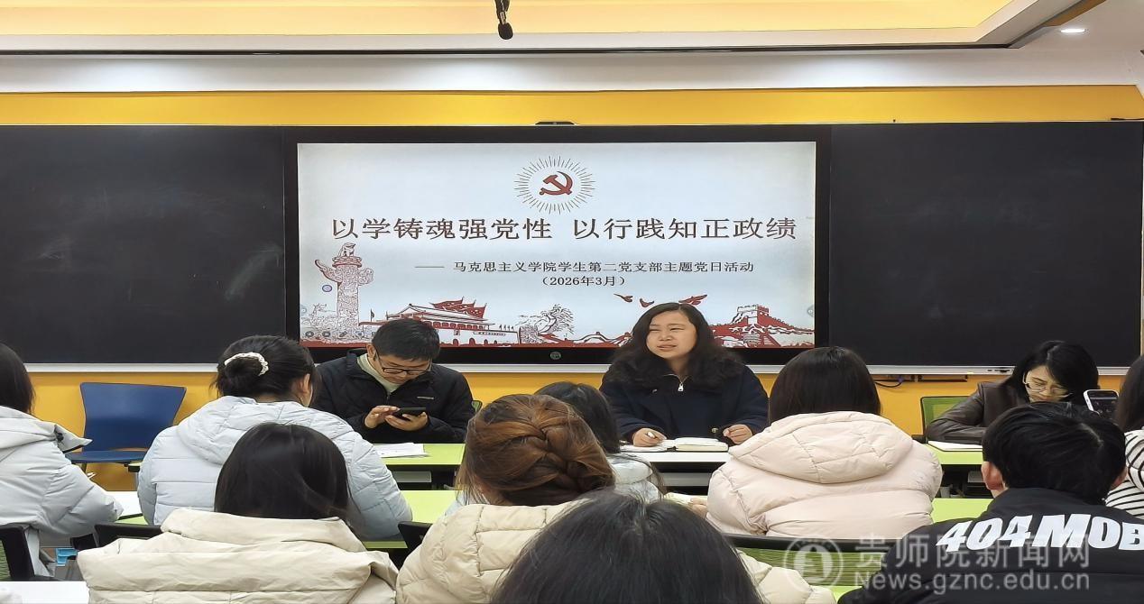 本网讯,为深入学习贯彻习近平总书记关于树立和践行正确政绩观的重要论述精神,引导广大党员坚定理想信念、锤炼坚强党性,2026年3月16日,马克思主义学院学生第二党支部在智慧教室组织开展“以学铸魂强党性,以行践知正政绩”主题党日活动。活动由学生第二党支部书记张静同志主持,支部全体党员和入党积极分子参加。