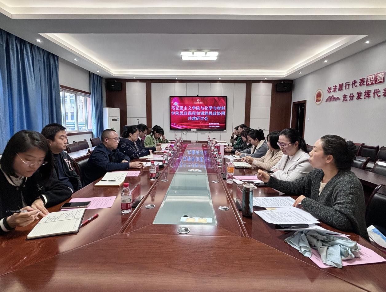 本网讯,为深入推进课程思政建设,促使各类课程与思政课程同向同行,以提高人才培养质量,11月6日下午,马克思主义学院和化学与材料学院在宁静楼525会议室联合举办“课程思政和思政课程协同共建研讨会”。化学与材料学院党委书记罗荣主持会议,两个学院领导班子成员及教师代表参会。