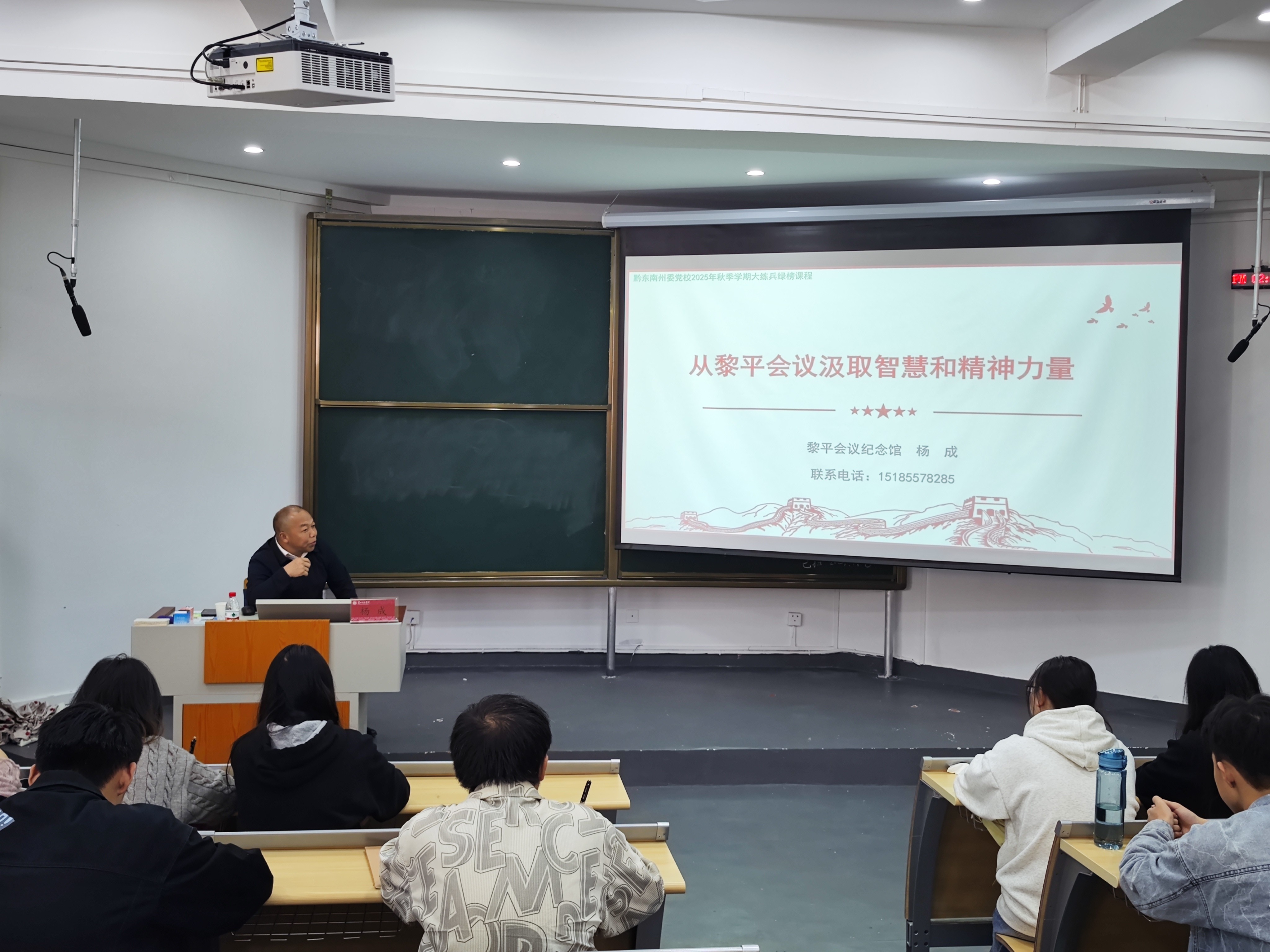 本网讯,为弘扬伟大建党精神,推动党史学习教育常态化长效化,2025年11月7日下午2点,马克思主义学院邀请黎平会议纪念馆办公室副主任、“黔东南工人大思政课”专家名师库成员杨成,在宁静楼235作《从黎平会议汲取智慧和精神力量》学术专题讲座,讲座由马克思主义学院党委副书记杨成友主持,2024级思想政治教育专业全体本科生参加聆听。