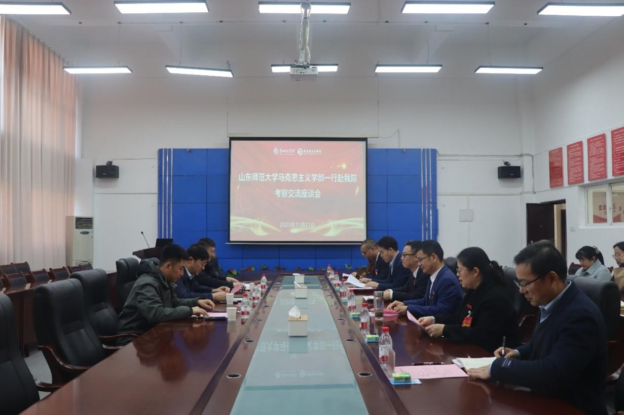 本网讯,为深化马克思主义理论学科建设,赋能思想政治教育高质量发展,2025年11月21日下午,山东师范大学马克思主义学部考察团一行莅临贵州师范学院马克思主义学院开展考察交流活动,交流座谈会在马克思主义学院第一会议室举行。