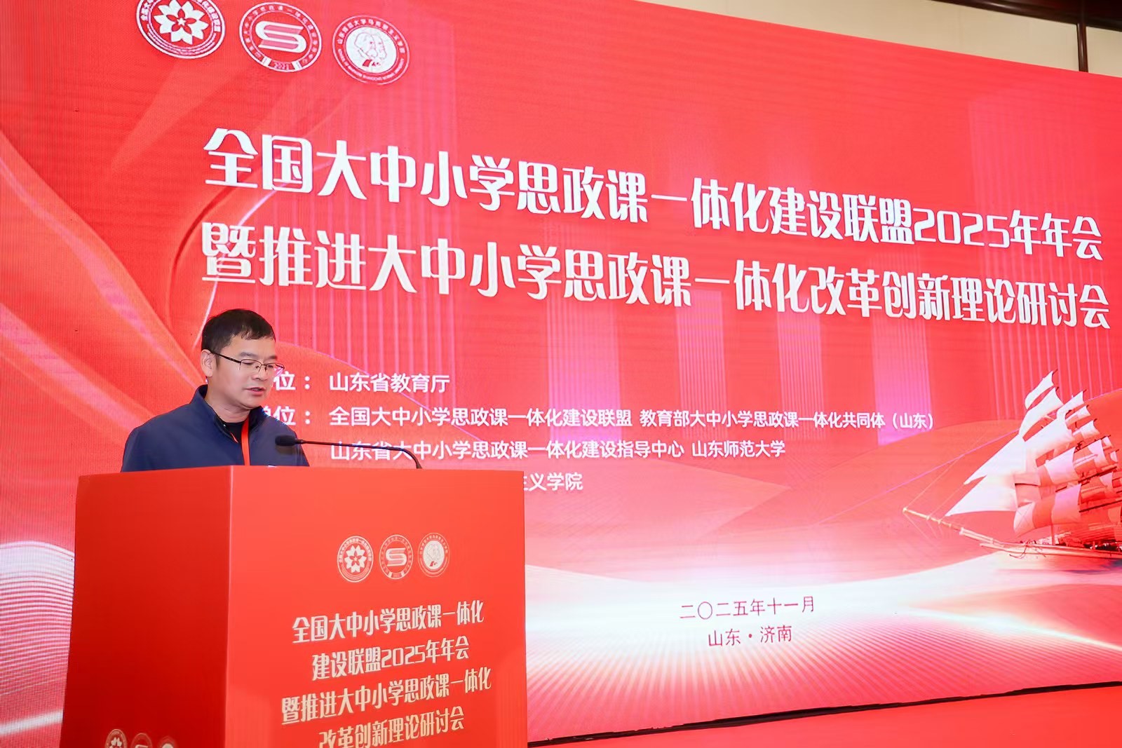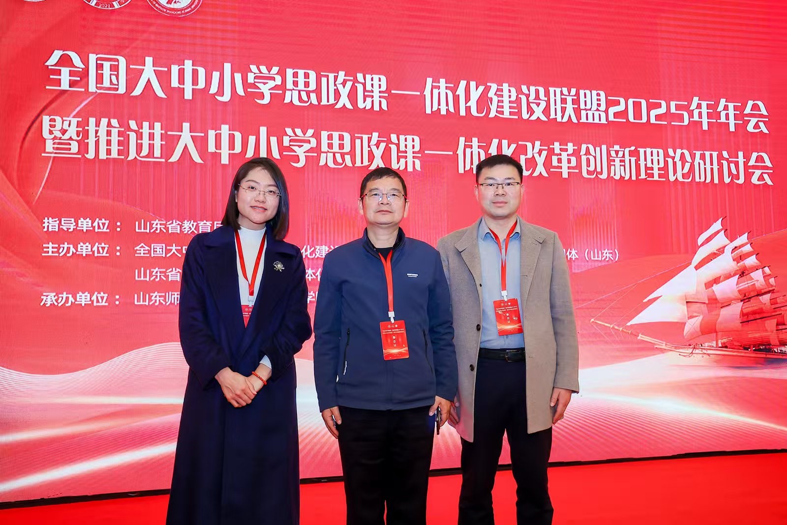 本网讯,2025年11月28日至30日,全国大中小学思政课一体化建设联盟2025年年会暨推进大中小学思政课一体化改革创新理论研讨会在济南召开。本次会议由全国大中小学思政课一体化建设联盟、教育部大中小学思政课一体化共同体(山东)、山东省大中小学思政课一体化建设指导中心、山东师范大学主办,由山东师范大学马克思主义学院承办。来自全国各省市高校250余位学者和研究生参会。校党委常委、副校长、马克思主义学院党委书记陈真波带领马克思主义学院副院长陈祖召和秦月副教授参会。