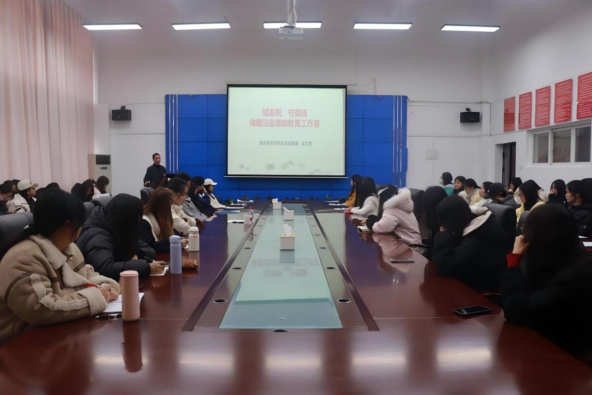 本网讯,为持续夯实学生党员廉洁从教的思想根基,强化纪律意识与底线思维,2025年12月1日,马克思主义学院学生党支部在学院会议室开展“知准则、守底线,做廉洁自律的教育工作者”主题党课。本次党课特邀贵州师范学院纪检监察室信访案件科科长龙见熙同志主讲,党支部全体党员、发展对象及入党积极分子参加学习。