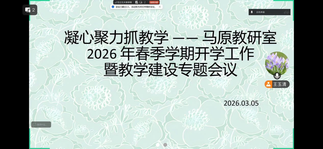 2026年3月5日,马克思主义学院马原教研室召开2026年春季学期开学工作部署暨教学研讨会,会议由教研室主任王玉清同志主持,教研室全体教师参加会议。会议聚焦开学教学准备、新版马原教学大纲与考核方案研讨、省教育厅思政“金微课”赛事筹备三项重点工作任务,统一思想认识,明确工作要求,全面部署新学期教学工作。
